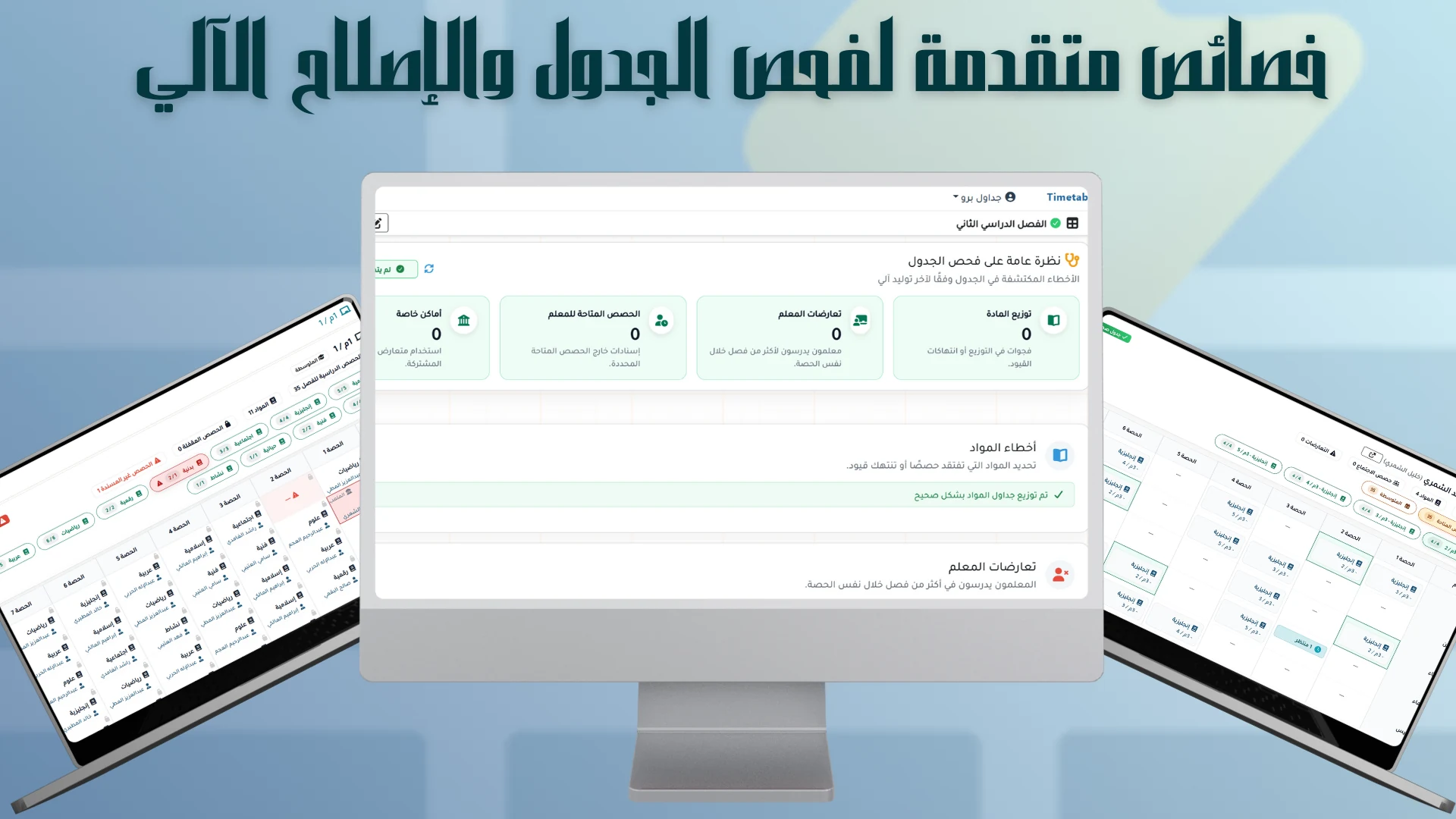 نعم. أثناء التعديل أو تبديل الحصص تظهر لك التعارضات فوراً (معلم/فصل/وقت) عشان تعدّل بثقة وتتجنب اكتشاف المشكلة بعد الطباعة أو أثناء اليوم الدراسي.
